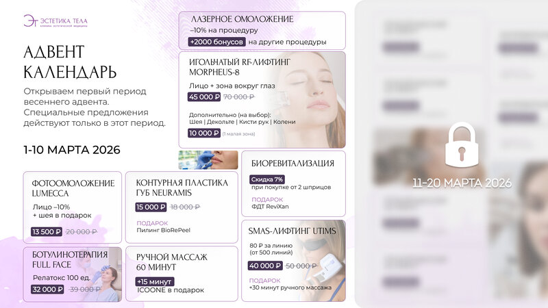 МЫ ЗАПУСТИЛИ АДВЕНТ-КАЛЕНДАРЬ ПРОЦЕДУР🔥 «Март возможностей»- это серия специальных предложений на популярные процедуры, которые открываютс...