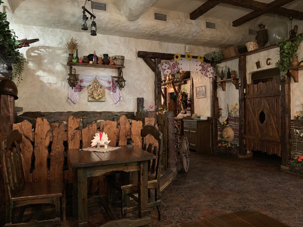 Интересный стильный интерьер, вполне неплохо готовят. Понравился набор сала и смальца, только вот гренки на масле в этом блюде совсем лишние. Лучше сразу брать корзину хлеба. Борщ в хлебе - средний. Хотя, не помню, чтобы на Украине его делали в хлебе, обычно этим славится Чехия. А вот, старые пампушки к борщу - это провал! Пампушки к борщу - это изюминка блюда, на этом нельзя экономить! Свинина с картошкой и двумя соусами (вроде называется Порося по-сиротки) была замечательная. Жене понравилась настойка "Слеза папы" (сам папа был за рулём :) ) Перепутали виды вареников - ребенку заказывали с мясом, принесли с картошкой и грибами - мы поздно заметили. Но, ошибку исправили - дали дополнительно с собой те, которые заказывали. Вареники нормальные, начинка из мяса вкусная, но многовато теста. Овощной салат состоит из отдельно крупно порезанных овощей и соуса. Крупно порезанная морковь, на мой взгляд, в этом салате явно лишняя. Обслуживание официантами нормальное, ждать долго не приходилось. Принимают к оплате карты. Чек обеда на семью из 3-х чел. получился 2200 руб. В праздники, чтобы пообедать нужно обязательно бронировать столик заранее с внесением аванса на месте не менее 1000 руб., что весьма не удобно. При этом, пока мы обедали, несколько столиков пустовало. Уже давно существует возможность оплатить бронь удаленно по карте. В целом заведение нормальное, нужно только пересмотреть рецепты некоторых блюд, следить за точностью исполнения заказа и улучшить систему бронирования столиков. Раз это кафе национальной кухни, не хватало негромкой музыки в стиле заведения.