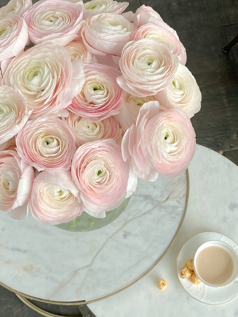 Кустовые пионовидные розы Silva Pink, ранункулюсы, одноголвые розы, эвкалипт, диантусы