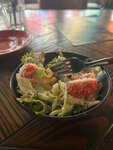 Заходили в обед и выбор пал на комплексные предложения! Порции вроде хорошие, принесли достаточно быстро! Но вот по вкусу конечно не вау’ 😮. Я прекрасно понимаю, что за 450 р два блюда и напиток это норм. Но салат был как будто не свежий, булгур с курице й это можно сказать одно название! Курицы там 50 гр! Действительно вкусным оказался морс!