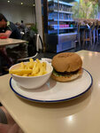 The cafe is located on the ground floor of the hotel. The interior design is simple, similar to a coffee shop. We ordered pasta with sauce and mushrooms and a veggie burger. Pasta is simple, you can cook it better at home. The burger was served with French fries, which taste very strange. The cutlet is burnt, very few vegetables. We waited for the order for 30 minutes.