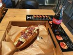 Брали хот-дог по техасски и острый мексиканский бургер с сальсой. Большие и сытные порции за небольшую стоимость. Резиновые перчатки шли в комплекте, поэтому есть было удобно.