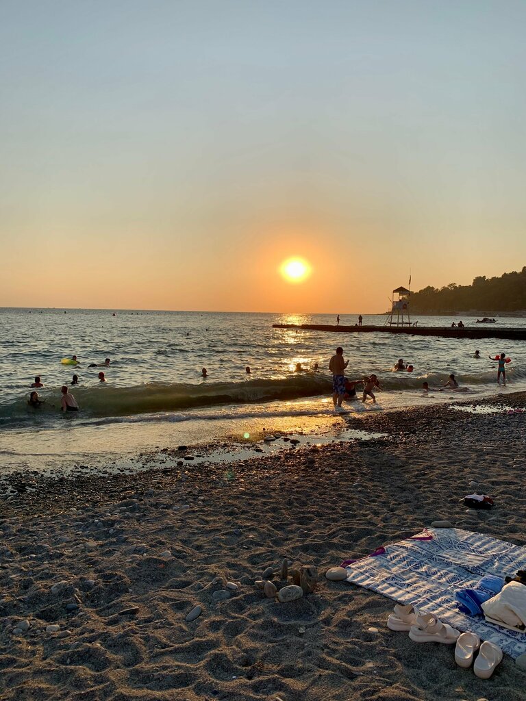 Самый отвратительный пляж Хосты. Кроме платных лежаков , на которые даже , когда на минутку какой нибудь пенсионер присядет , сразу бегут с криками платите. Даже ребёнок , присел , маму ждал пока она переодевалась в раздевалке , подбежала женщина и говорит : ,, встань , или плати,, . Ничего святого 🤦 Про душ вообще отдельная история , он просто не работает . Чтобы сполоснуться после солёной воды , нужно идти в отель видимо. Просто обмотали его лентой , вроде как не работает. Вот вам и центральный городской пляж. 1 августа 2025 года. Развитие Хосты идёт семимильными шагами , только в прошлый век. Странно правда , почему все хотят отдыхать за границей 🤷