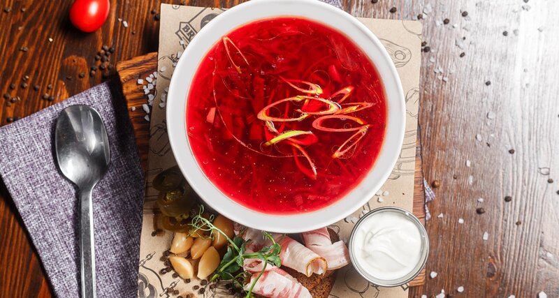 Борщ московский со сметаной, бутербродом с салом