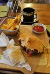A campaign of three people came to this institution in the afternoon. It looks attractive from the street - panoramic windows, lanterns at the entrance, a beautiful and cozy interior in a modern style. There was another table served besides us. We ordered 6 food items and a pot of tea. The wait was more than 20 minutes. Learn more about the dishes I ordered: Lentil cream soup. The pitch is beautiful. I would rate it 3 out of 5 (not bad, but I didn't feel any excitement either). The soup was served with two halves of a small, slightly toasted slice of toast bread. Personally, I've already run out of bread for 1/3 of the soup I've eaten. Double cheeseburger with beef. The portion is large. Served with French fries and ketchup. The meat seemed to me quite tasty and juicy. Now about the cons. The bun is a little dry. The pickled cucumbers had to be pulled out, as they greatly outweighed the taste of all other ingredients. It is good practice to serve gloves to a large burger with juicy cutlets. There were no gloves here, which made it uncomfortable to eat. French fries look very interesting, but they taste quite the opposite. It's a little dry and looks like it's been frozen several times. I can't remember exactly what kind of tea they took, it was quite normal. The kettle was enough for three people with two cups each. In general, the place is positioned as a coffee bar. Apparently it was necessary to take coffee with desserts here, but we came to have a full lunch, and everything I ordered from the food left mixed impressions.