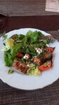 Когда пришли, стол был грязный, салфетки не подали, меню дали только одно на двоих, цены в меню были устаревшие и мы немного удивились когда принесли счёт. Цезарь с курицей был вкусный, хычины тоже, а вот шашлык из мякоти баранины был пересолен и частично плохо жевался.