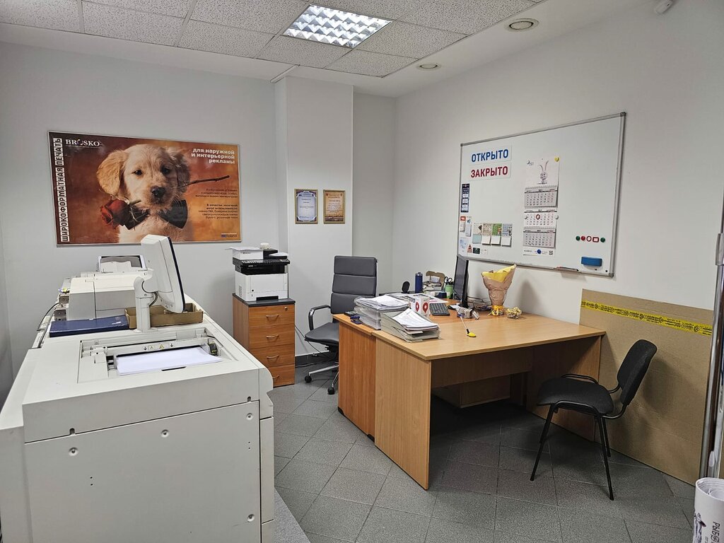 Types of print:banners, posters, interiors, on canvas, on film, on plastic, on magnets, on cardboard, on vinyl