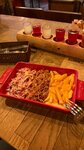 Свиные рёбра, фирменный соус BBQ, карамелизированный лук, картофельные дольки, коул слоу