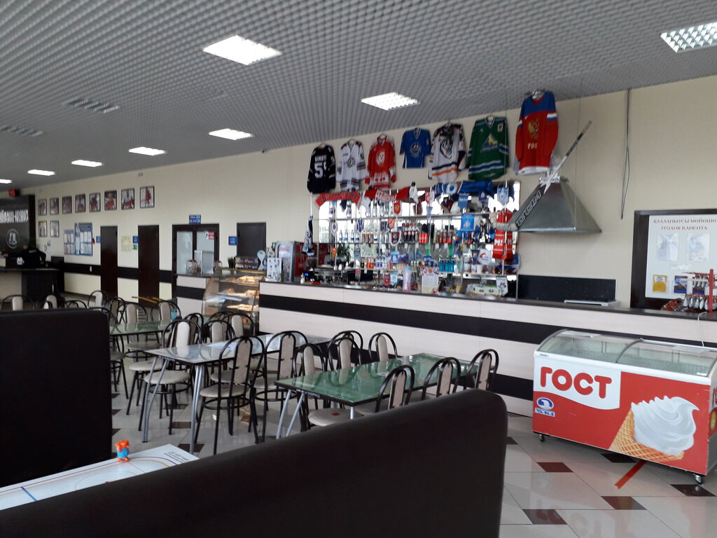 Кафе при ледовой арене. Кофе, чай, свежая выпечка, вода, соки, сладости. Если попросить девочки сделают блинчики.работают с утра до вечера. Помогает скоротать время