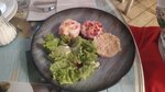 Пришел в ресторан поесть. Салат не ахти, салат горький, курицы мало, оливки вообще не в тему. Стейк из индейки отличный вкусный, не пережаренный хороший, но салат на тарелки не к месту вообще. Не вкусный листья салата с песком, помидорок почти нет (тк порезанная очень мелко и тонко). Интерьер нормальные. Но ощущение грязи есть, тк под стеклом, которое лежит на столе видно грязь.