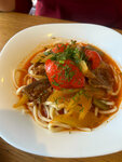 Традиционное узбекское блюдо из домашней лапши, вытянутой вручную, говядины и овощей: помидоры, перец сладкий, сельдерей. Приготовленное по-особому рецепту. Подается с жареным яйцом