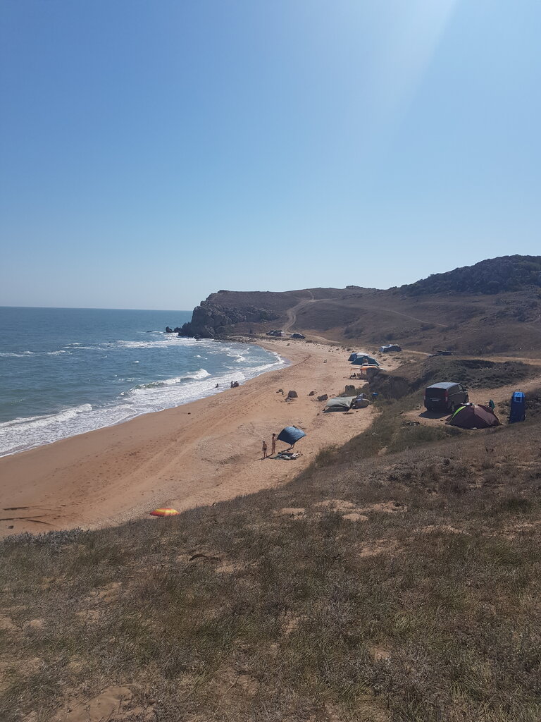 Бухта "Вдохновения". Очень красиво, есть гроты, закрытые маленькие пляжи. Пресной воды рядом нет, так что запасайтесь. Тенты, навесы рекомендуется. Аккуратно на воде, море хоть и мелкое, но очень переменчиво, пляж и дно-песок с подводными камнями. Берите паспорта - пограничная зона. Если ехать аккуратно можно проехать и на седане. В степи много мелкой живности(змеи, пауки, сколопендры), но на пляже замечены не были. На пляже телефон не берет, надо подниматься на горку.