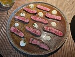 Шашлычки из свиной шеи на обжаренной тортилье с азиатским соусом, перцем халапеньо, луком в свекольном маринаде и малосольными огурцами