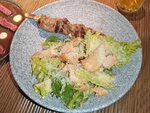 Классический салат с хрустящими гренками, листьями салата, томатами, сыром грана падано, соусом айоли и шашлычком из куриного бедра на гриле