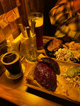 Сочный стейк из свиной шеи, подается с румяным картофелем, хрустящим коул-слоу и вишневым BBQ соусом, который идеально сочетается с мясом.