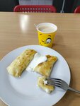 Купил на завтрак яичницу с сосиской и три блинчика с творогом+2 капучино ☕☕-все приготовлено "от души" ❤️ заботливыми руками повара. Блинчики -чуть поджарены чтобы конвертик не терял форму😋.... Так только в дорогих ресторанах или дома делают.! (Чек за завтрак 485руб)