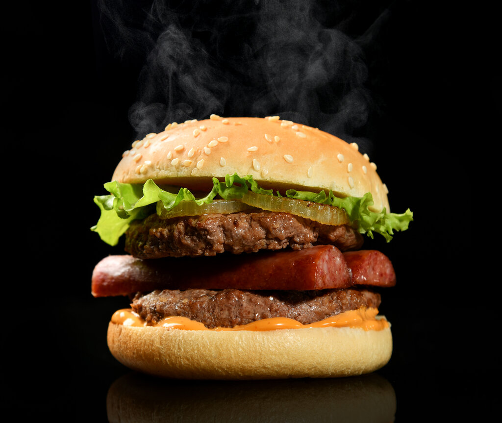 Булка с кунжутом, котлеты говяжьи 2 шт. (прожарка well done), салат айсберг, колбаски охотничьи, соус чипотл