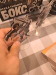 В общем, пошли на поводу у маркетинговых уловок и сходили в данное заведение за боксом-коллаборацией "Атака титанов" Стаканов в продаже нет, будут только в октябре. Сам бокс - ну такое, не старались они совсем, соус в бургере: кетчуп и майонез. Фигурки оч дешёвые, я случайно сломал одну, когда собирал Само заведение хорошее, прикольные столики с освещением