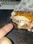 Купил дорогущий ангус бургер с сыром. Когда ел его на зубы попалось что-то твёрдое (на фото, скорее всего кусок кости) и от этого откололся кусок зуба. С трудом написал в поддержку (при вводе адреса как в чеке чат меня посылал нахрен перенабирать). Было указано что мне ответят в течение 30 минут, по итогу через два дня мне позвонили, чтобы уточнить email, всё по буквам продиктовал, перепроверили. И всё, спустя неделю никакой обратной связи (в папку спам тоже ничего не приходило...).