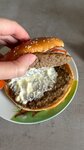 Приготовленный на огне бифштекс из 100% говядины, два нежных ломтика сыра, сочные помидоры, свежий нарезанный салат, густой майонез, хрустящие огурчики и свежий лук на нежной булочке с кунжутом