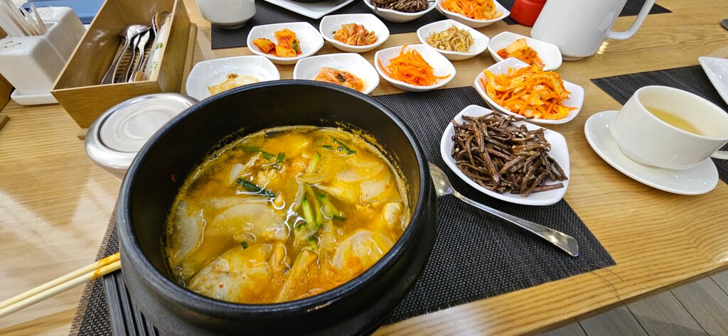 Был тут на ДР друга, поэтому оценка как за застолье, а не личное посещение) зал достаточно большой, общий и если кто-то ещё будет отмечать своë застолье, то вы будете рядом + люди которые просто зашли покушать. Еду корейскую готовят прям вкусно. Пробовал много блюд и все вкуснятина) Вот обслуживание хромает, официанта было трудно поймать и они редко подходили к столу. Но знакомые корейцы говорят, что в Корее обслуживание вообще "хромает" - блюда вам вынесли и дальше сами, поэтому может они держат марку) В общем, т.к. заведение в России убрал звезду за обслуживание и отсутствие места для банкетов.