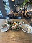 Салат вкусный с лососем и яйцом пашот, но сырники слишком сладкие и маслянистые, кофе первый раз принесли горький - попросила переделать, принесли без льда - закончился. Забыли принести трубочку и не забрали грязную тарелку, когда я перешла ко второй. Обслуживание сильно хромает, цены слишком высокие за такое качество еды - не советую.