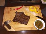 Меню небольшое, большую часть занимает винная карта, несмотря на это, доступны не все блюда из меню. Подают всё одновременно - апперитив, основное блюдо, чай, пиво. Подача очень красивая. Мясо повар не испортил, хотя, со степенью прожарки не угадал, по качеству самого мяса есть вопросы, но стейки получились вкусные, сочные. Цены довольно высокие.