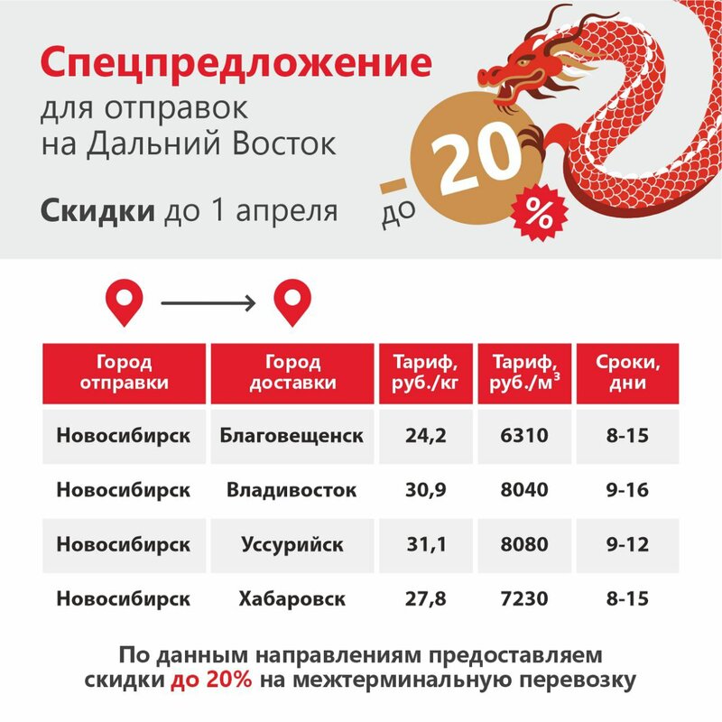 Спецпредложение для отправок на Дальний Восток! Специальные тарифы действуют на межтерминальные перевозки по ряду направлений из Новосибирс...