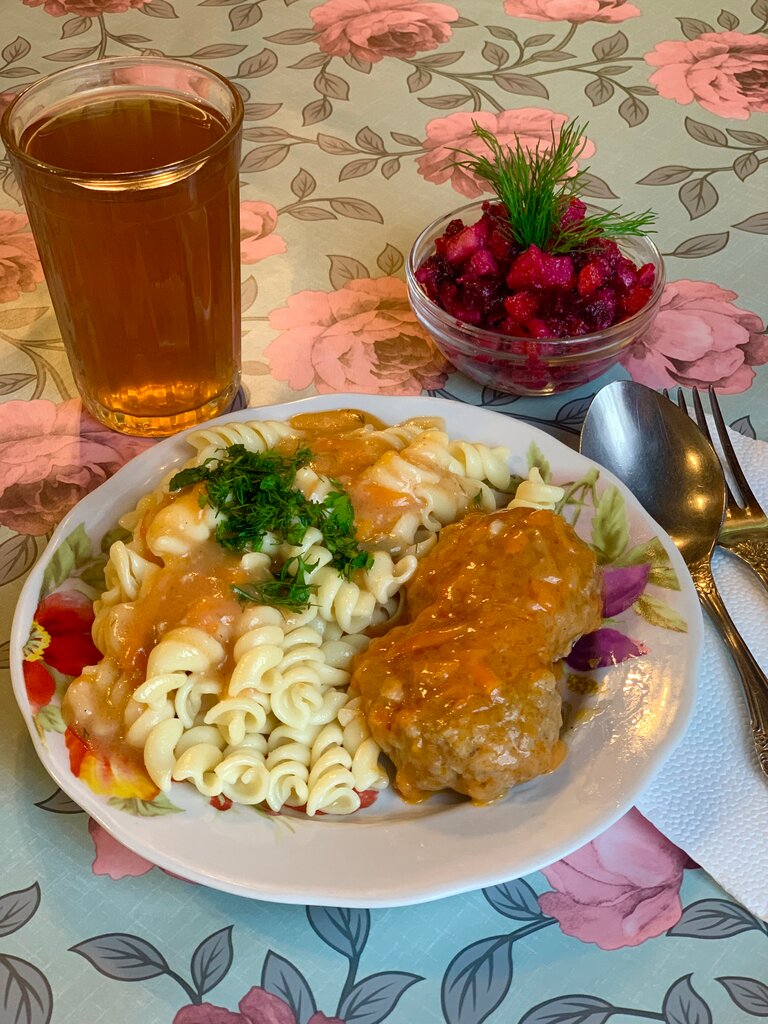 Просто супер 👍 Настоящая домашняя еда, очень вкусная и порции достойные. Вчера обедал: салат столичный, суп гороховый, рис с котлетой, компот и хлеб, и это всё за 460₽. Сегодня: салат свекольный, суп харчо, гречка с тефтелями, компот, хлеб, и это за 490₽... В общем, категорически рекомендую 👍 если хотите вкусно, сытно и без понтов покушать, то это здесь! P.S. - Обед на фото - 490₽...