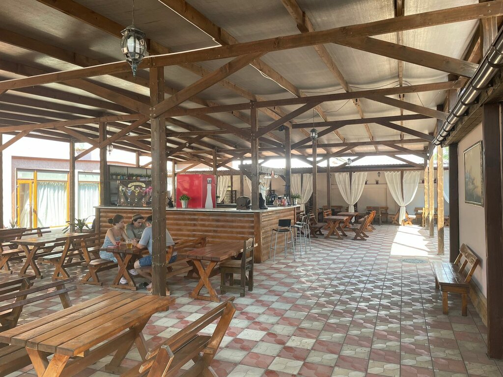 Хорошее местечко, были там в обед, никого не было из посетителей. Наш ребенок спокойно бегал. Еда вкусная, ценник примерно такой же как и везде в Заозерном. Супчик лапша куриный 200₽ или 250₽ точно не помню, рапаны жареные 350₽. На 4х пообедали на 1500₽. Мангал в обед не работал, сказали в основном вечером много заказывают, а в обед пришлось бы ждать долго. Помещение как крытый дворик, так что сплита нет