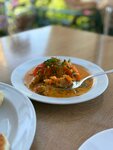 Только веганское меню, принимают заказ долго, готовят долго, но все вкусно и доступно по цене. Можно сделать заказ и погулять по саду или на смотровой пока его готовят. Котлета из нута и вареники с вишней 🔥. Поесть можно на открытой террасе в саду