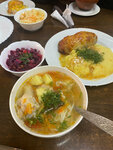 Заехали перекусить после посещения с. Константиново. В 18-30 в наличии было почти все из меню. Суп есть в двух вариантах порции. Брали солчнку, хорчо и грибной все понравились. На второе был бтфштекс, люля и мясо по-французски. Люля очень вкусная. Заказ и оплата на стойке. Можно подзаочдить телефон. Кофе средний. Большой выбор выпечки