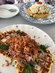 Интересно стилизовано. Достаточно вкусно были приготовлены блюда на фото (картофельная вафля с вешенками и беконом, драники, тост с рыбой. Авокадо брали как добавку. Выпечка тоже вкусная. Особенно треугольник с манго 🥭. Столики и стульчики на улице показались хлипенькими. Но выдержали нас))) Посуда заворожила)) Вежливые девушки. Ценник может чуть выше схожих кофеен по городу. Спасибо!