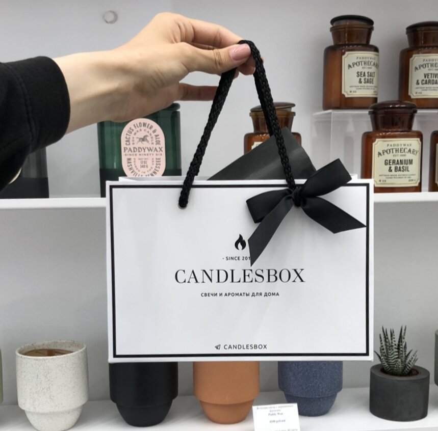 Необычный ассортимент, большой выбор ароматов. Свечи есть разные по объёму и оформлению. Можно подобрать подарочный вариант. Фирменная упаковка очень стильная ( чёрный пакет с бантом).