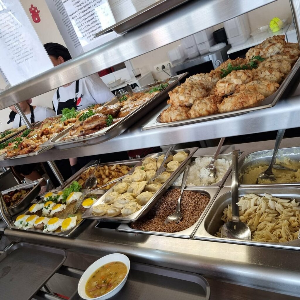 Отличная столовая. Чисто. Большой выбор блюд и напитков. Всё вкусное и свежее. Обслуживание норм. Завтрак и обед здесь 👍. Обед на троих 1100-1300 рублей в 2025 году. Большой зал. Удобный график работы. Рекомендую