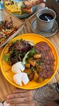 Delicious Food, fast and attentive service! The best Shakshuka in Almaty! I have my own yearbook. A very cozy and beautiful space! There is a library. There is a children's play area And sockets for creating a workplace. One of the best establishments in the area of Megi and Gagarin Avenue.