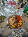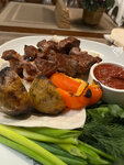 Очень противоречивые ощущения))) Были в будний день около шестнадцати часов - не самое загруженное время. Хотели посидеть на улице, даже определились с блюдами, но, оказывается, на улице часть блюд не подаются, часть блюд в стопе и почему-то время ожидания составляет сорок минут и более - получается того нет, этого нет - честно, я уже встала, чтобы уйти. Нас попросили перейти внутрь. И там оказалось как будто другое заведение - оказывается все есть, все подают и очень быстро. Да и меню более расширенное. Дама-официант молодец - все подсказала, все быстро организовала, в общем обслуживание внутри сильно отличается от обслуживания снаружи) Теперь по блюдам. Шашлык божественный. Порция огромная. В порции ещё половина поджаренной луковицы, картошечка, перчик (болгарский гриль и острый), зелень, соус, лаваш. Все выглядит великолепно, на вкус, повторюсь, чудесно. Цена более чем адекватная. Квас с хреном очень вкусный - терпкий, крепкий, густой, насыщенный. Хреновуха, по ощущениям, увы, на четыре с минусом (почему-то самая классная была на севере, теперь все сравниваем с ней). Салат Морской коктейль очень не понравился; во-первых это все было с майонезом (в меню майонеза не было указано; хорошо, что майонез внизу и можно было выложить на тарелочку и постараться не есть), лук - не только зелёный, но и репка (хотя лук своей жёсткостью вкуса забивает нежный вкус морепродуктов; лук, как и майонез, тоже лишний); креветки - кислые 😳 - не испорченные, а то ли вымоченные, то ли маринованные). Мидии безвкусные совсем. В общем из салата пришлось выбрать пять кусочков лосося, а все остальное оставить. Счёт получился очень адекватный, даже с учётом алкоголя. По итогу, сюда за шашлыком; сидеть внутри!)))