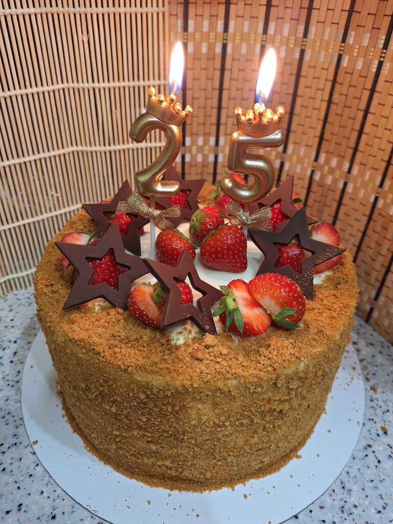 Заказывала торт себе на День рождения. Медовик, дизайн выбрала сама. Торт очень вкусный, клубника сладкая, тоже очень вкусная. Заказывала 2кг, цена порадовала, выполнили заказ в срок, без проблем! Есть доставка, что очень удобно. Однозначно буду заказывать ещё! Отличная кондитерская!