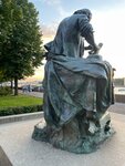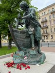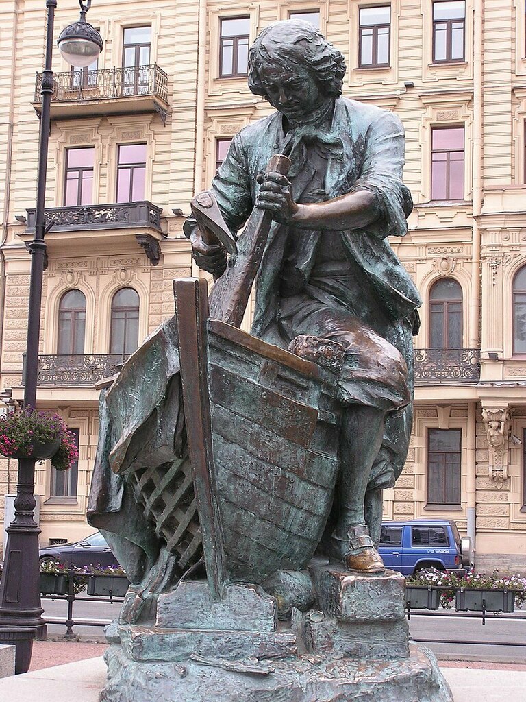 Русский царь Николай II присмотрел на Парижской Всемирной выставке гипсовые слепки двух памятников Петру I выполненных Леопольдом Бернштамом. Понравились они ему, и царь повелел отлить слепки в бронзе. Так оба этих памятника – “Царь-плотник” и “Царь Пётр спасает тонущих рыбаков” – оказались в начале прошлого века на Адмиралтейской набережной. Но… большевики не любили монархов и… уцелевший Царь-плотник, что можно видеть сейчас – это уж реплика с другого оригинала из Нидерландов. Сто лет назад, кстати, наши-то ревновали. Ох, ревновали! Александр Бенуа, в ту пору лидер городского кружка художников, сетовал: “Ах, эти патетические жесты, это безжизненное понурое лицо, вся эта условная декоративность дешёвого стиля модерн!» Историки архитектуры Петербурга называли памятник “некрасивым комком бронзы”. Что ж, на вкус, как говорится, и цвет не накинешь узду. А вот мне увиделся в бронзе прежде всего человек. Человек, который занят своим делом – ремеслом строителя. И какими бы легендами не обрастал образ Петра, но та, что воплощена Бернштамом – царь-плотник – мне по душе более всех. А то, что монарх не показан во всём своём величии, как, например, горделивый всадник – подарок Екатерины, так оно, может быть, к лучшему. Пётр Бернштама опустил голову, занят и сосредоточен. И в этом образе он особенно хорош, как память о человеке-основателе города, что носит его имя.