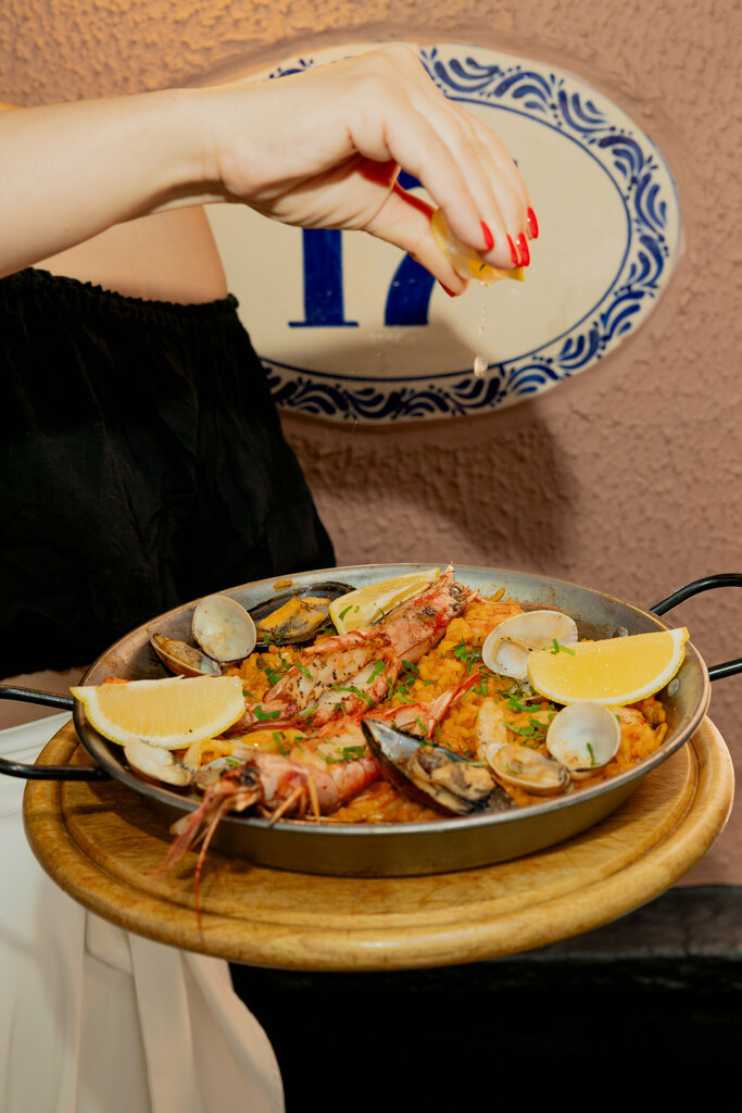 Паэлья-это всегда фейерверк вкусов. В данном случае — ароматная композиция из риса, креветок, кальмара, мидий и вонголе в сочетании с обжаренным болгарским перцем, луком и стручковой фасолью