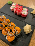 подача очень красивая, тут ничего не скажешь. роллы были насыщенного вкуса, начинка свежая, огурцы хрустящие, авокадо слегка горчил. паста с креветками на любителя, не каждому понравится, очень специфичный вкус, но креветки просто отменные! взяла на десерт себе творожный пирог, очень мягкий, свежий, красиво выглядит. подается со сгущенкой, что делает его намного вкуснее.