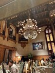 Интерьер очень красивый, прямо на 5+. Высоченные потолки, витражи как в костелах, много натурального дерева - перила, лесенки, рамы, пол и т.п. Светло, много персонала. Наверное, это хорошо. Но именно для общих мероприятий, банкетов, корпоративов. Не знаю, бывают ли здесь тихие уютные ужины в полумраке. Кухня богатая. Очень понравились рыбные горячие блюда. Да и рыба в нарезке тоже хороша. Вкусным был жюльен в горшочке из запеченного теста. Но черная икра показалась суховатой. Блины к ней подавали холодными. Малина была кисловатой и контрастировала с кусочками спелого сладкого манго. Понравился травяной чай. Красное вино (не помню название) показалось кисловатым и слабо насыщенным для красного вина. Немного не хватало свободных изолированных пространств в холле или рядом с главным залом, куда можно бы выйти для телефонного разговора, где была бы нормальная звукоизоляция и устойчивая связь или где можно бы тихо переговорить.