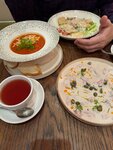 Обедали семьей из четырех человек. Еда вкусная, в этом плане твердая 5, обслуживание на 5, расположение на 5. А вот интерьер и первое общее впечатление на 3, не хватает какого-то уюта что ли. Вроде бы и кафе не претендует на высокий ресторанный уровень, но помимо еды хочется еще эстетики, чтобы интерьер радовал глаз. На фото в отзывах видела скатерти в красно-белую клетку на столах, но их не оказалось вживую. С ними было бы куда лучше, не так пусто что ли. Место популярное, почти все столики были заняты. Скорее всего вернемся попробовать остальные блюда. Цены умеренные.