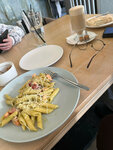 Забрели случайно, интерьер смутил, оказывается он у них такой интересный)… Все о очень вкусно! Наполеон волшебный нежный, кофе вкусное, паста с лососем пальчики оближешь, ребенок пиперони пиццу всю съел, однозначно рекомендую как вкусно и солнце прямо в окно светит☀️но тут есть и место в тени, приятного аппетита 😋