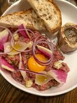 Тартар из говядины, запеченая мозговая косточка, хлеб
