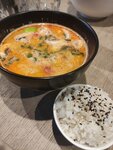 Интерьеру можно поставить 5. Всё в современном стиле, лаконично, без лишних деталей, удобство в простоте! Меню довольно разнообразно, есть стандартные позиции и что-то "на необычном". Как и всегда в подобных заведениях заказал том ям. На вид подача неплохая, но с точки зрения употребления не до конца продуманная. Тарелочка для риса очень маленькая, не удобно его брать, падает на стол. Долька лайма уже плавает в супе, а холелось бы отдельно, чтобы выдавить его в рис. Сам суп вкусный, наваристый, в меру острый. Однако качество морепродуктов немного расстроило. Кольца кальмара очень тонкой нарезки, больше похоже на пакетированную заморозку, нежели на кальмар, порезанный на кухне поваром. Плавает несколько маленьких мидий. К креметкам вопросов нет. Не хватило начинки. Ценник в рамках разумного. За эту стоимость ожидаешь конечно большего, хотя возможно себестоимость блюда уже на грани окупаемости. К сервису и персоналу вопросов нет, над меню я бы поработал. Возможно зайду еще, если в соседнем небезызвестном заведении опять будет очередь.