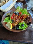 Еда вкусная. Пробовали шашлык, шампиньоны, картошку, гренки с пармезаном. Приятная обстановка, ежедневно живая музыка под гитару, русский рок, девушка солистка очень талантливая, душевная. Вид на море шикарный