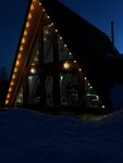 Большой А-фрейм треугольный коттедж, для отдыха семьей или компанией до шести человек. Коттедж внутри в темных тонах.