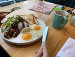 Хотела просто зайти и выпить чашку кофе, но нашла на террасе уютный столик, посмотрела меню и решила заказать завтрак. Обслуживала очень вежливая и милая девушка. Завтрак оказался огромным и очень вкусным. Мне понравилось это кафе. Специально зашла внутрь, чтобы посмотреть интерьер. Открытая кухня, красивый дизайн, все продумано и стильно.