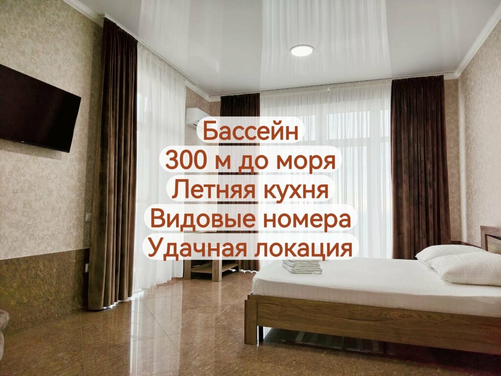 Чистота и интерьер на хорошем уровне. Но не хватает некоторых аксессуаров, например стаканчика для зубных щеток. Кухня и холодильник общие. Полупрозрачная для света дверь а номер. Завтраки средние. Периодически у бассейна бывают компании, которые любят громкую музыку, а после 23.00 - громко бубнить. Несмотря на все моменты, думаю, что эта гостиница для Симеиза вполне удачный вариант.